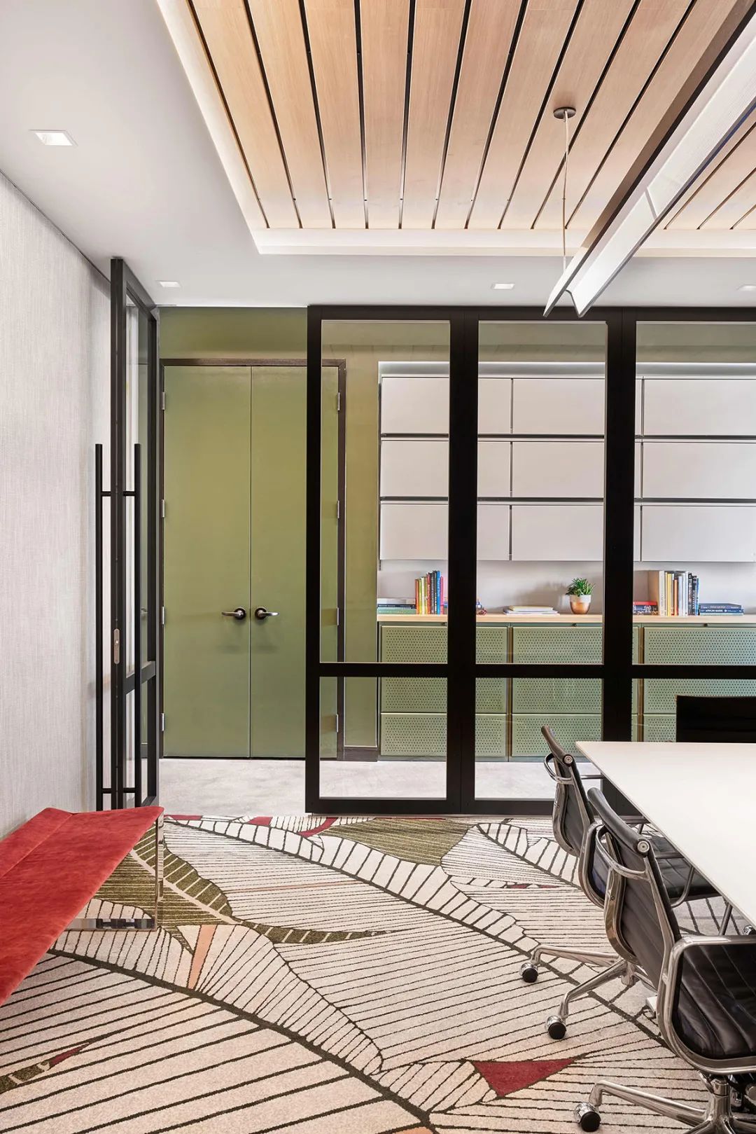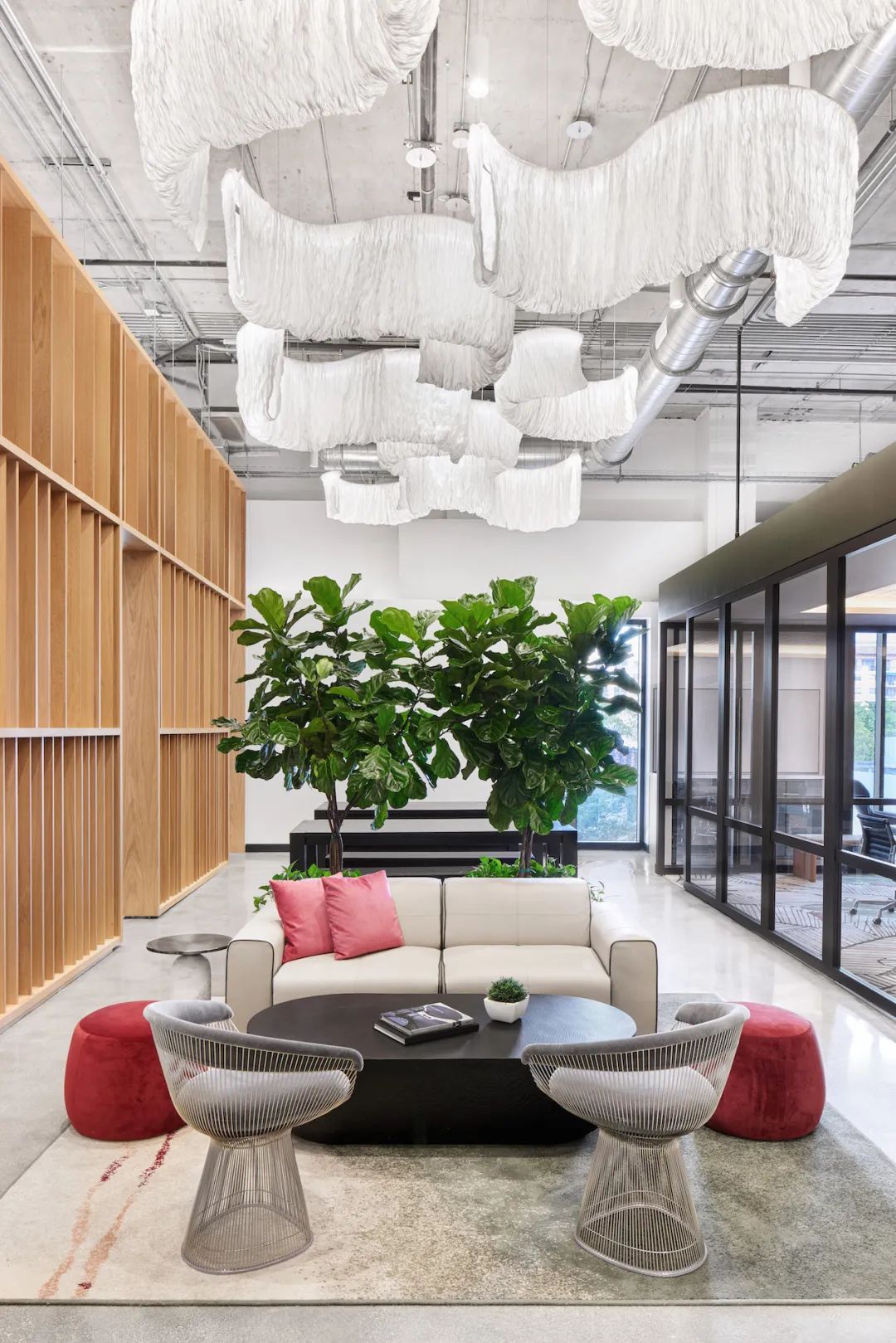 設(shè)計(jì)汲取自然、城市肌理和酒店設(shè)計(jì)的豐富經(jīng)驗(yàn),營(yíng)造出多元精致、時(shí)尚舒適的場(chǎng)所氛圍。辦公空間面積約700平方米,接待區(qū)寬敞溫馨,高達(dá)4.6米、寬12.8米的溫潤(rùn)木質(zhì)屏風(fēng)映入眼簾,自然光被巧妙引導(dǎo),提升了空間的藝術(shù)美感和生命力。