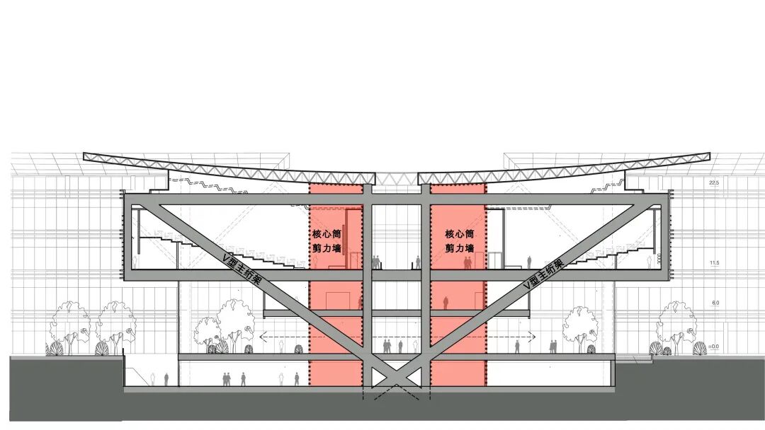 會(huì)議中心前廳為無(wú)柱空間,四組交通核心對(duì)稱設(shè)置于建筑中央,形成垂直剪力墻核心筒,水平構(gòu)件采用鋼結(jié)構(gòu)垳架懸掛吊柱、箱形鋼梁等多種特種結(jié)構(gòu)組合,共同形成了高效合理的大跨度鋼框架—砼剪力墻復(fù)合結(jié)構(gòu)體系,實(shí)現(xiàn)了三層大空間的會(huì)議功能需求。