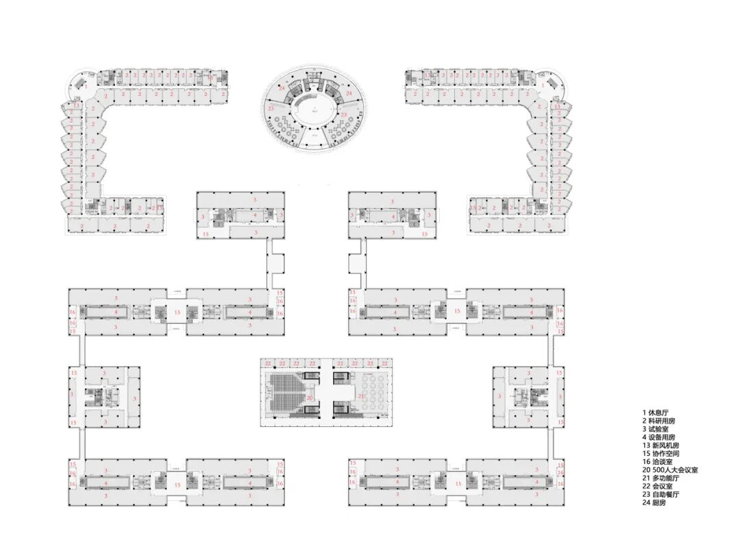 作為本項(xiàng)目主體功能的中試空間以模塊化、標(biāo)準(zhǔn)化為原則,兼顧靈活性與可變性,8 個(gè)類相似試驗(yàn)?zāi)K(A、B、C模塊)圍繞會(huì)議中心,沿用地邊界展開(kāi)設(shè)置,滿足多樣化試驗(yàn)需求。多組多規(guī)模試驗(yàn)?zāi)<卧騼蓛山M合,或連廊串聯(lián),即保證了中試試驗(yàn)的相對(duì)獨(dú)立性,又實(shí)現(xiàn)了整個(gè)園區(qū)室內(nèi)空間的可達(dá)性和高效聯(lián)系。為科研建筑標(biāo)準(zhǔn)化建造的探索,提供了行之有效的設(shè)計(jì)實(shí)踐。