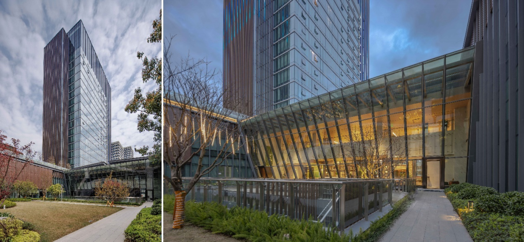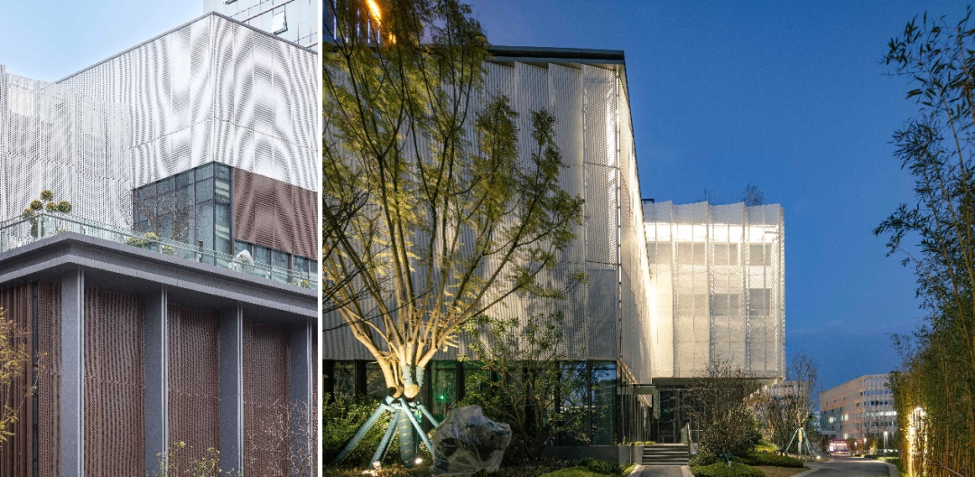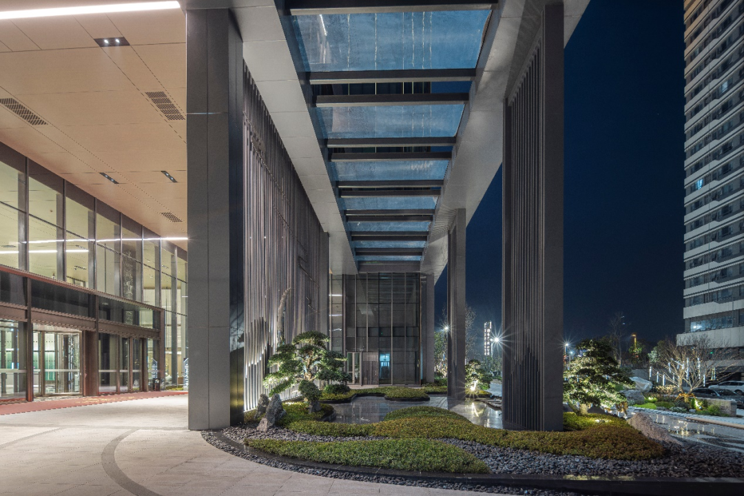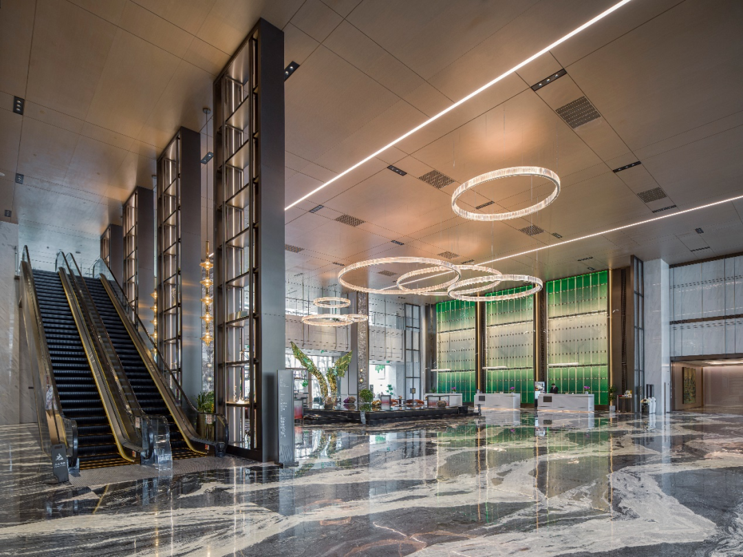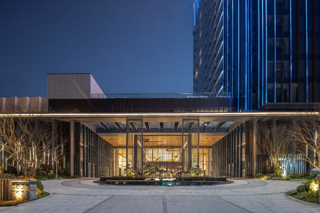 立面設(shè)計以 “精致韻律” 為核心,通過裝飾柱廊、鏤空格柵與高透玻璃的虛實結(jié)合,構(gòu)建層次豐富的建筑表情。定制化的鋁型材柱廊,形成莊重而不失輕盈的序列感;弧形穿孔鋁板幕墻模擬水波紋理,陽光透過時在灰空間投射出粼粼光影;建筑在裙房形成體量穿插,通過體塊的錯動與疊加,在建筑底部形成退臺、灰廊等過渡空間,客人穿行其間,可感受材質(zhì)肌理、光影變化與空間尺度共同營造的體驗感,實現(xiàn)功能理性與美學(xué)表達的統(tǒng)一。