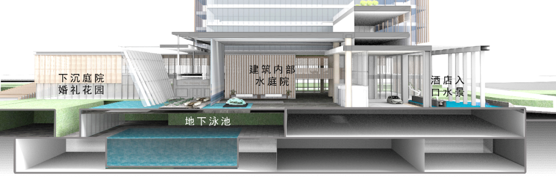 在緊湊用地條件下組織功能,以 “立體高效” 為核心理念,滿足五星級商務(wù)酒店的多種功能需求。從功能布局來看,中部挑空 18 米的通高大堂宛如 “城市會客廳”,以扶梯樓梯與垂直電梯為紐帶,將北側(cè)私密靜謐的客房區(qū)、全日制餐廳與南側(cè)的宴會廳、多功能會議室串聯(lián)成有機整體。這種 “一軸兩翼” 的布局方式,既保證了商務(wù)會議、宴會活動的流線高效,又通過獨立出入口設(shè)計實現(xiàn)了住客休憩與公共活動的動靜分區(qū)。負一層通過下沉式采光庭院引入自然光線。波光粼粼的水下游泳池采用全景玻璃幕墻,將庭院綠植與水波紋路融為一體。建筑充分利用裙房屋頂空間,形成多層級的垂直花園。