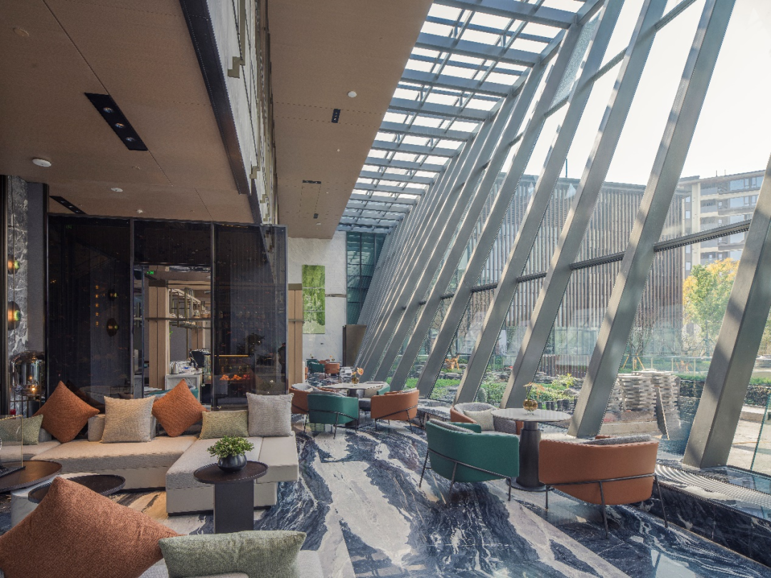 大堂吧以通高玻璃幕墻為媒介,將內(nèi)院水庭景觀引入室內(nèi),構(gòu)筑鏡花水月、虛實相生的空間體驗。曲面玻璃的運用不僅強化了建筑與自然的對話,也成為內(nèi)院視線的焦點,重新定義了室內(nèi)外的視覺邊界。