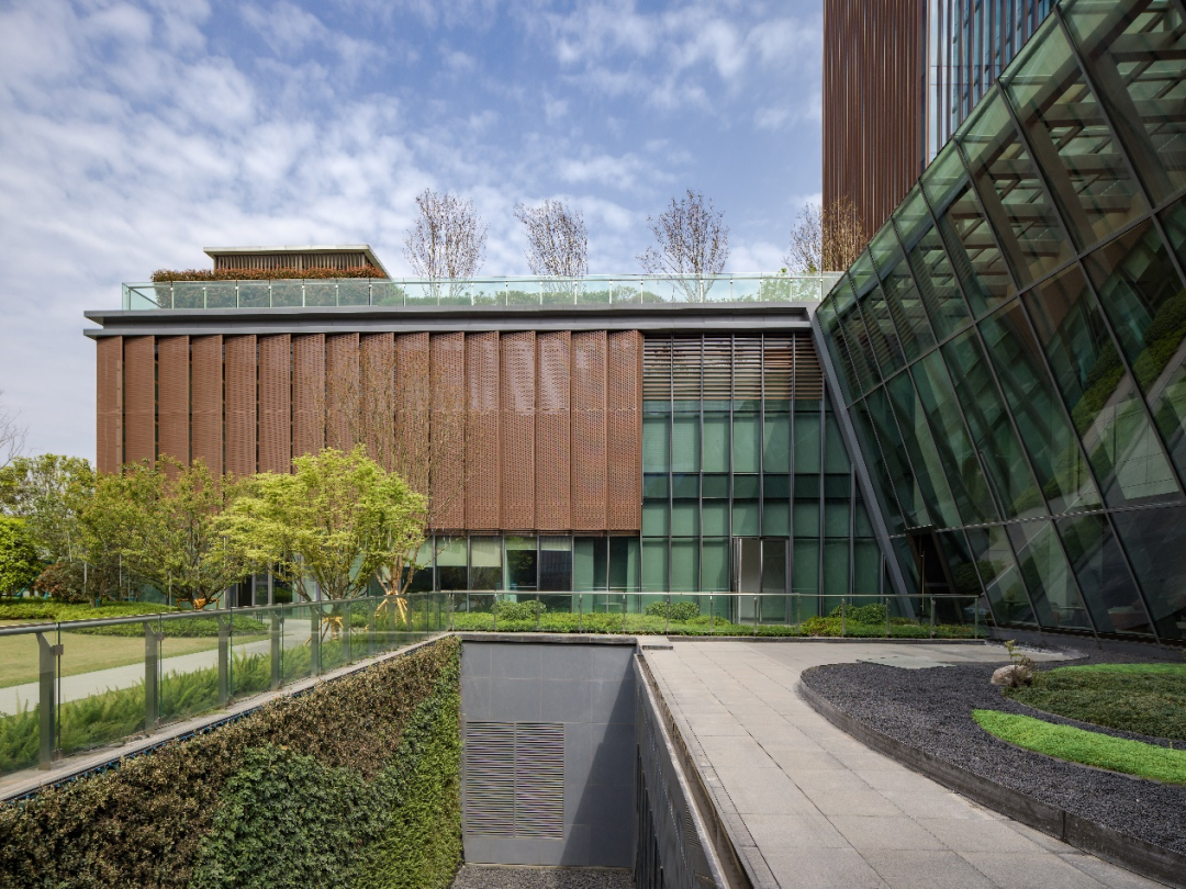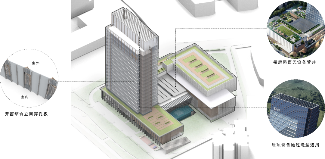 幕墻、景觀、室內(nèi)控制及設(shè)備專業(yè)精細配合,嚴(yán)格控制設(shè)備百葉、立面開啟扇設(shè)置,保證建筑外立面后期高完成度呈現(xiàn)。裙房金屬屋面及裙房景觀屋面經(jīng)配合不外露任何設(shè)備及管線,保證建筑第五立面的高完成度呈現(xiàn)。