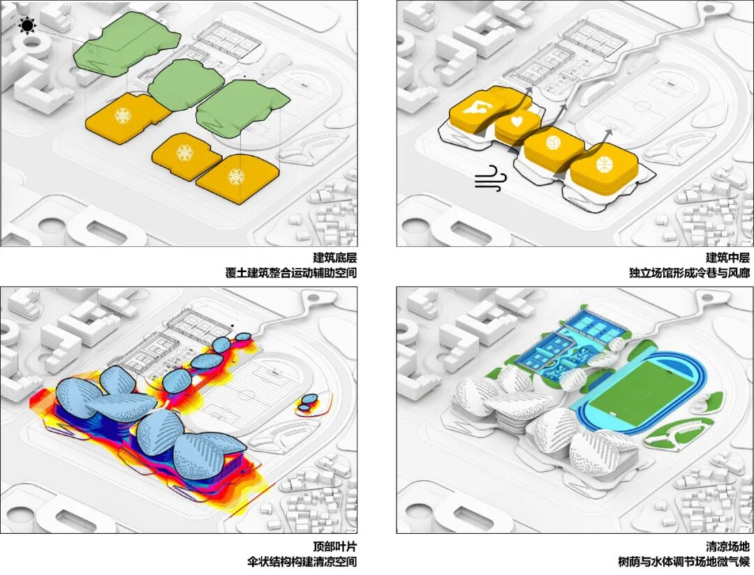 項(xiàng)目突破傳統(tǒng)文體中心固化形態(tài),以“有機(jī)細(xì)胞”為理念,構(gòu)建出一個(gè)可生長(zhǎng)、可調(diào)節(jié)的功能聚落。綜合體育館、游泳館、城市客廳等如同獨(dú)立細(xì)胞,通過平臺(tái)連廊串聯(lián)為功能共生體,實(shí)現(xiàn)分時(shí)獨(dú)立運(yùn)營(yíng)與賽時(shí)整體協(xié)作。模塊化架構(gòu)賦予建筑持續(xù)演進(jìn)的生命力,可根據(jù)城市發(fā)展與使用需求靈活調(diào)整功能,實(shí)現(xiàn)從“建造完成”到“持續(xù)生長(zhǎng)”的范式轉(zhuǎn)變。