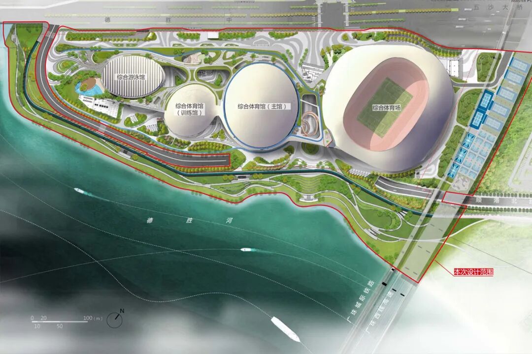 德勝體育中心位于順德重要水道德勝河畔,是廣東省及佛山市重點工程。 該項目投資近30億元,總建筑面積約21萬平方米,包含“三館一場”:2萬座綜合體育場、1.2萬座綜合體育館、2000座游泳館和2000座訓(xùn)練館,配套停車位約1200個及商業(yè)設(shè)施,可容納約3.2萬名觀眾。