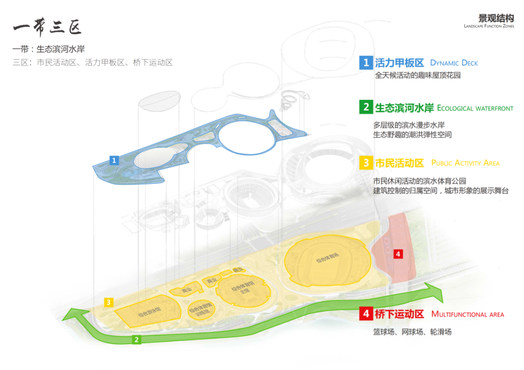 德勝體育中心的景觀設(shè)計以“人與自然和諧共生”為核心理念,巧妙構(gòu)建了“一帶三區(qū)”的多元景觀結(jié)構(gòu),旨在打造一個超越賽事本身、服務(wù)于城市與市民的綜合性公共空間。
