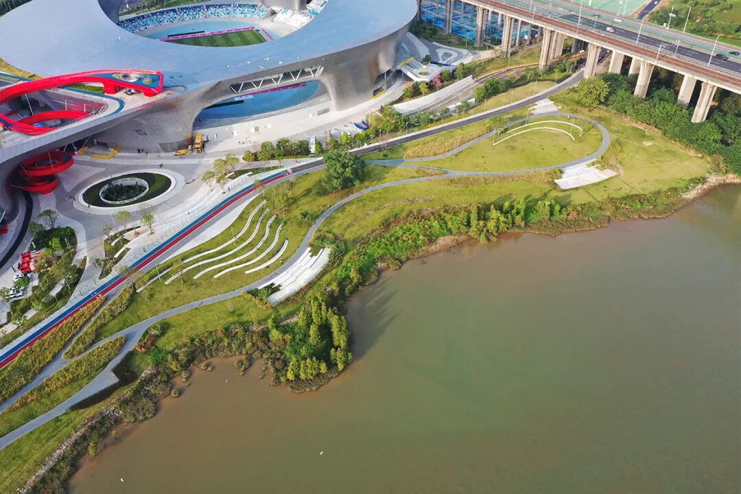 作為第十五屆全運會佛山賽區(qū)的重要場館,由棕櫚設(shè)計參與打造的順德德勝體育中心,不僅是一座現(xiàn)代化的競技賽場,更是一張融合了生態(tài)、活力與城市精神的景觀名片。設(shè)計團隊以超越場館本身的宏大視野,通過三大核心策略,將這里塑造為服務(wù)賽事、惠及市民、對話灣區(qū)的城市新地標。