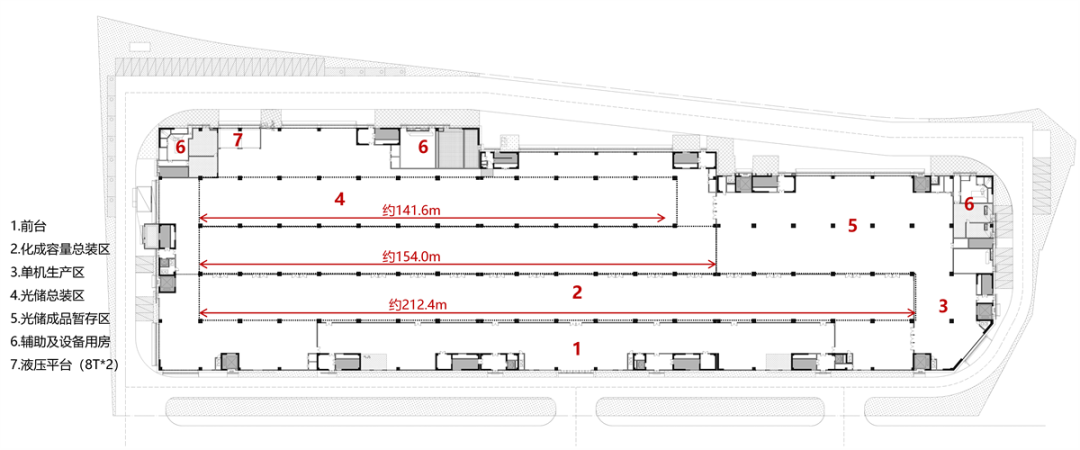a. 大平面:廠房平面尺寸249.1m(長(zhǎng))*72.3m(寬),在生產(chǎn)主層規(guī)劃了長(zhǎng)度分別為141m、154、212m的三條生產(chǎn)線,充分滿足大規(guī)模生產(chǎn)的需求。