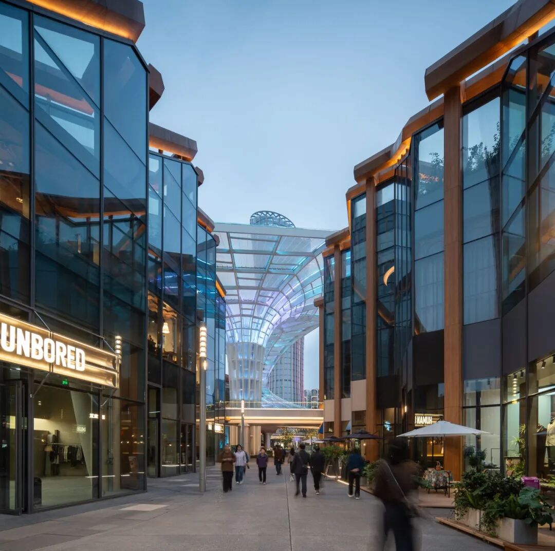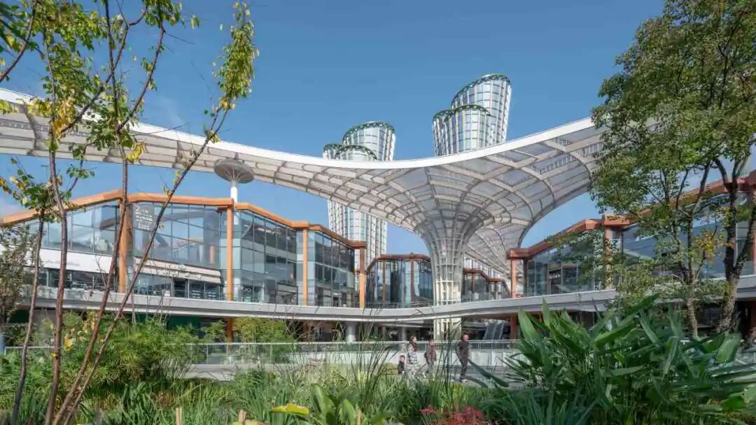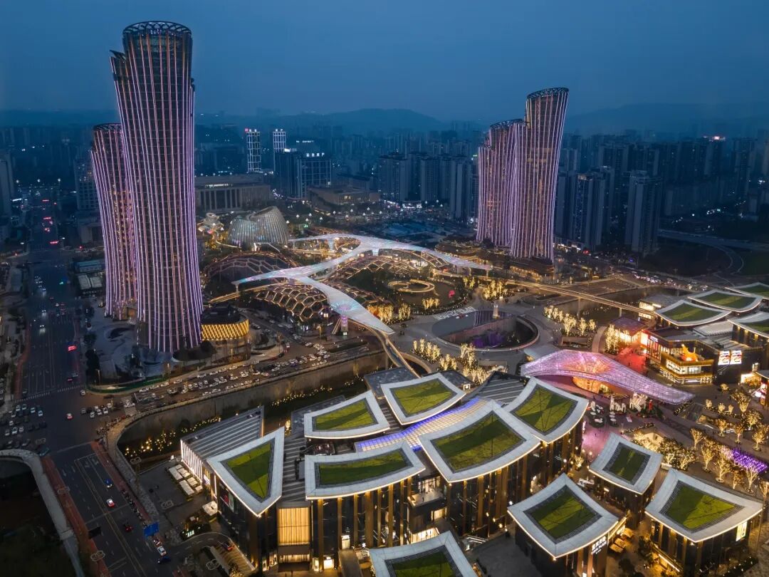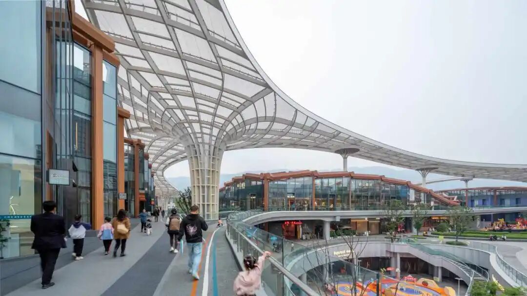 項(xiàng)目的可持續(xù)發(fā)展策略包括:建筑幕墻集成新風(fēng)通風(fēng)、雨棚及高采光低得熱系統(tǒng),生態(tài)屋面全域覆蓋。同時(shí),多棟站前廣場(chǎng)商業(yè)建筑更率先應(yīng)用四川省首例重組竹平面桁架結(jié)構(gòu),并結(jié)合光伏屋頂,生動(dòng)詮釋了綠色科技與地域文化的創(chuàng)新融合。