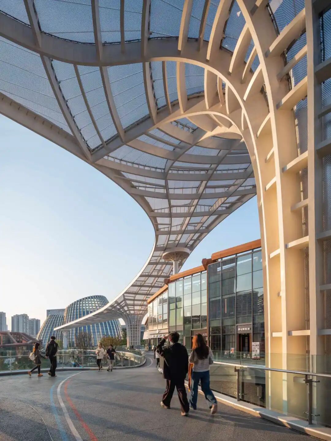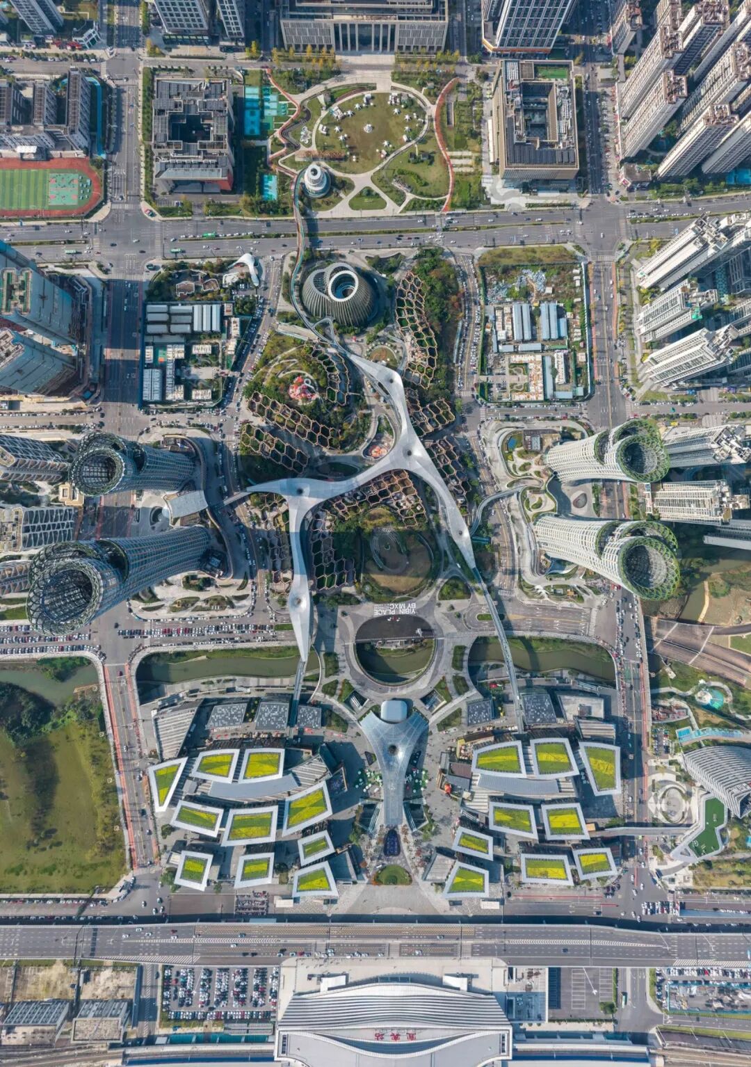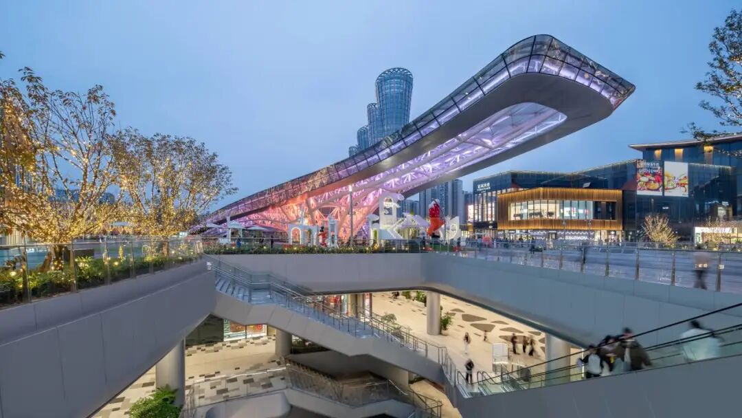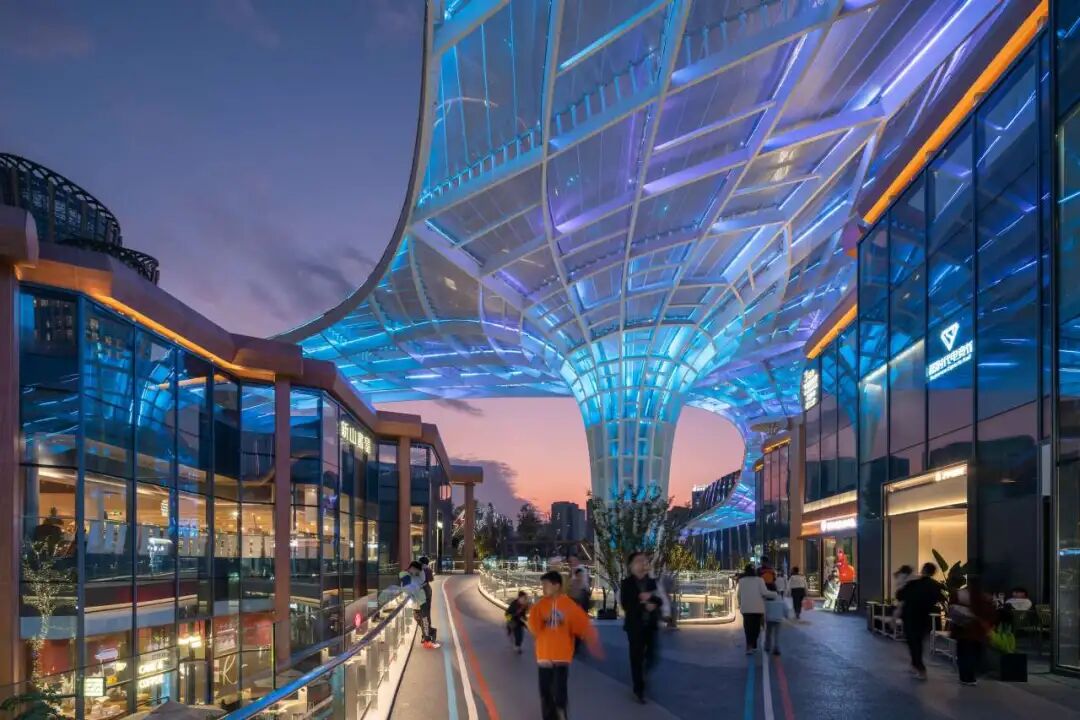 項(xiàng)目的可持續(xù)發(fā)展策略包括:建筑幕墻集成新風(fēng)通風(fēng)、雨棚及高采光低得熱系統(tǒng),生態(tài)屋面全域覆蓋。同時(shí),多棟站前廣場(chǎng)商業(yè)建筑更率先應(yīng)用四川省首例重組竹平面桁架結(jié)構(gòu),并結(jié)合光伏屋頂,生動(dòng)詮釋了綠色科技與地域文化的創(chuàng)新融合。