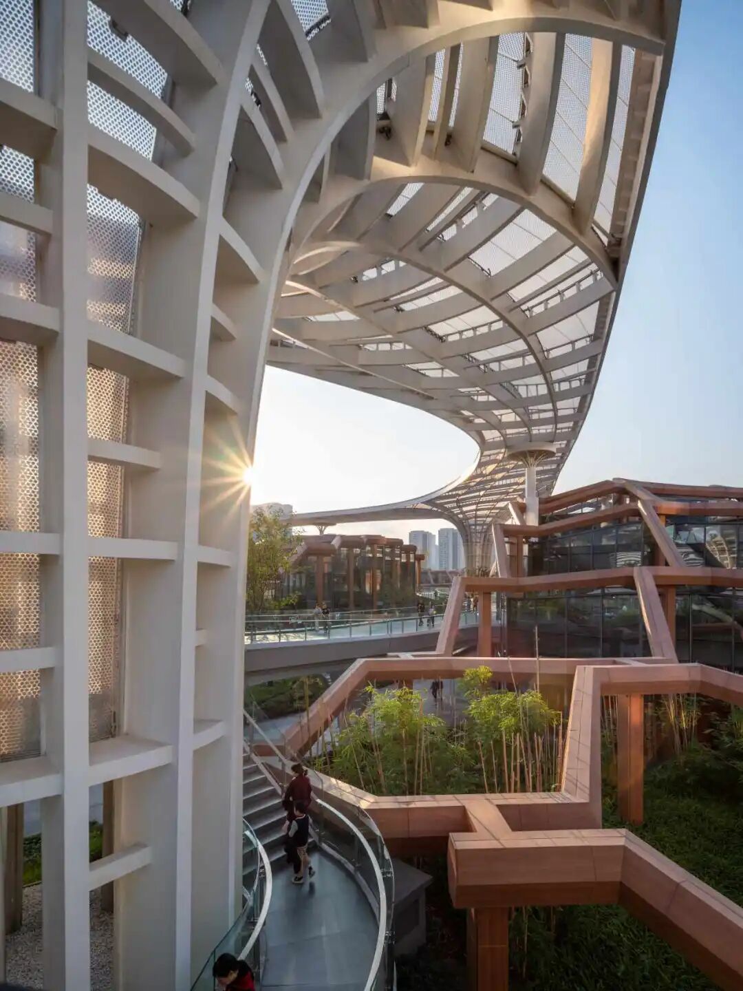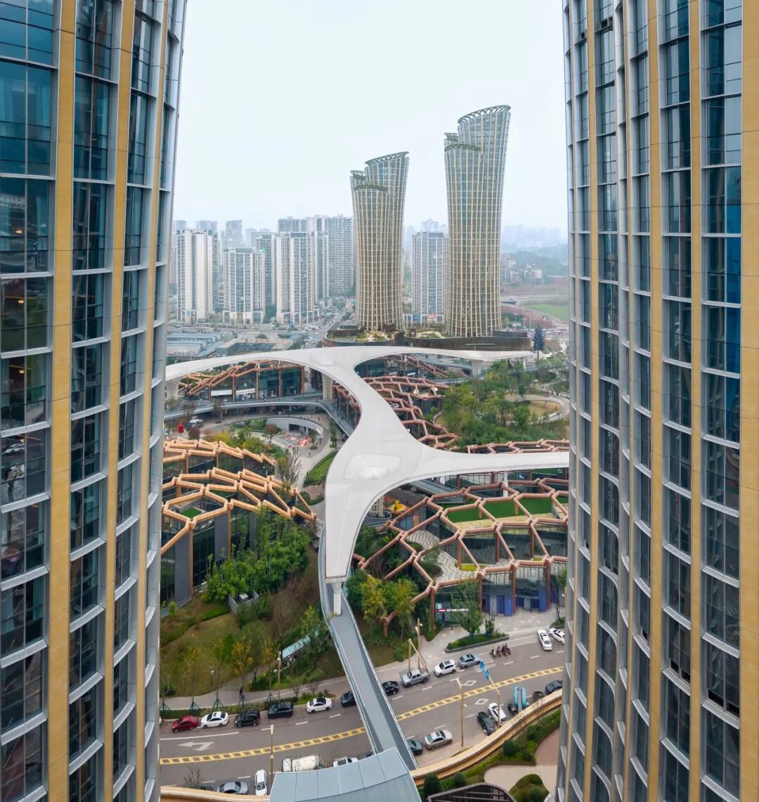 總體規(guī)劃融合了綠植屋面、種植露臺(tái)和露天步行體系,再現(xiàn)森林地表的層次感。核心區(qū)八座極具雕塑感的塔樓拔地而起,其設(shè)計(jì)靈感源于翠竹的形態(tài)與剛?cè)岵?jì)的特質(zhì),由佩里克拉克建筑師事務(wù)所(PC&P)攜手本地設(shè)計(jì)機(jī)構(gòu)四川省建筑設(shè)計(jì)研究院(SADI)共同創(chuàng)作。這些塔樓高度從 23 層到 33 層不等,以富有韻律的束狀組合排列,通過曲線化形體與豎向肌理的強(qiáng)調(diào),將本地傳統(tǒng)文化中的竹意書法筆觸轉(zhuǎn)化為現(xiàn)代建筑立面語匯。