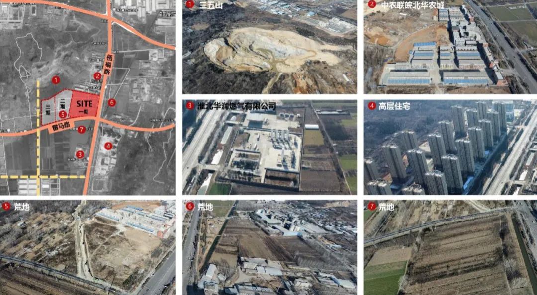 園區(qū)地處淮北市烈山經(jīng)濟開發(fā)區(qū)北端,基地東側住宅、商業(yè)較多,人流集中,西側緊鄰二、三期地塊,西北側為三五山,南側多為工業(yè)用地,北側緊鄰中農聯(lián)皖北華農城。
