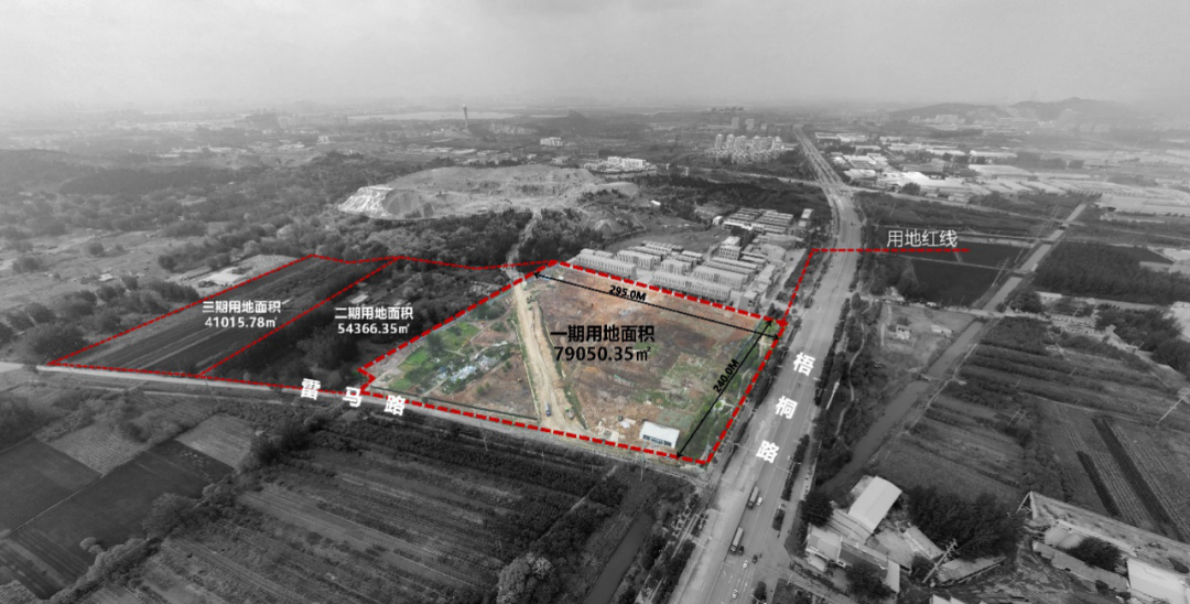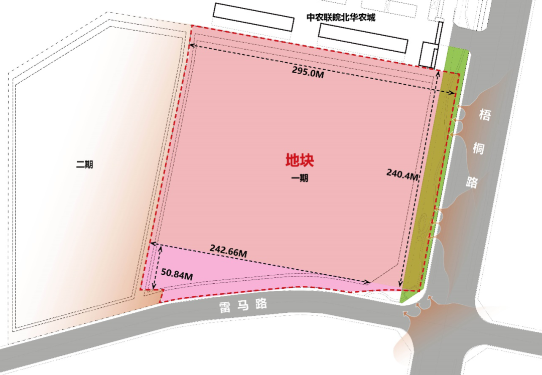 本項目為一期項目,左側緊鄰二期項目。一、二期用地均呈不規(guī)則形狀,二期用地南北狹長。