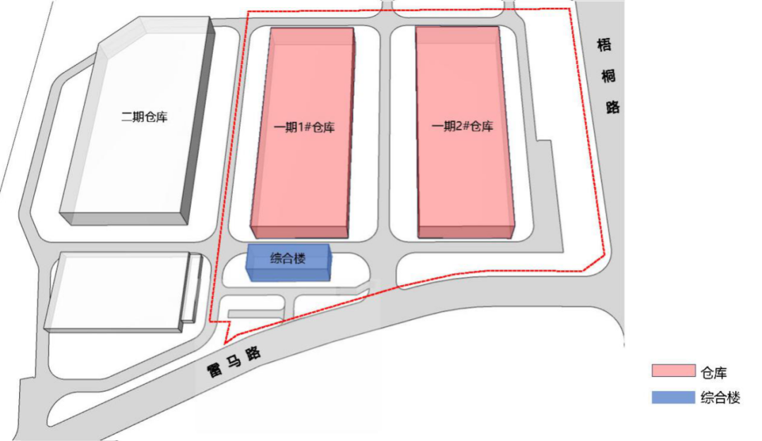 倉庫沿梧桐路展開,主體以灰白色彩鋼板為主,窗間墻等采用深灰色彩鋼板,端部和墻身局部點綴紅色,外掛的三個豎向交通盒分割立面形成有秩序的節(jié)奏感。