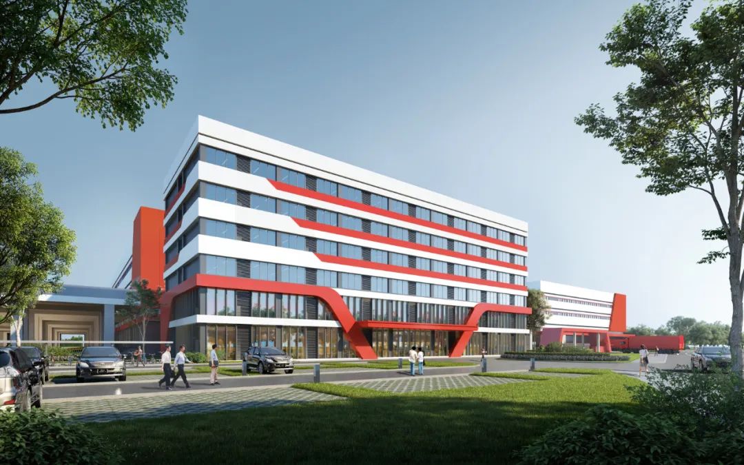 綜合樓主體以灰白色真石漆為主,橫向點綴紅色金屬漆,局部采用鋁板增強立面質感。