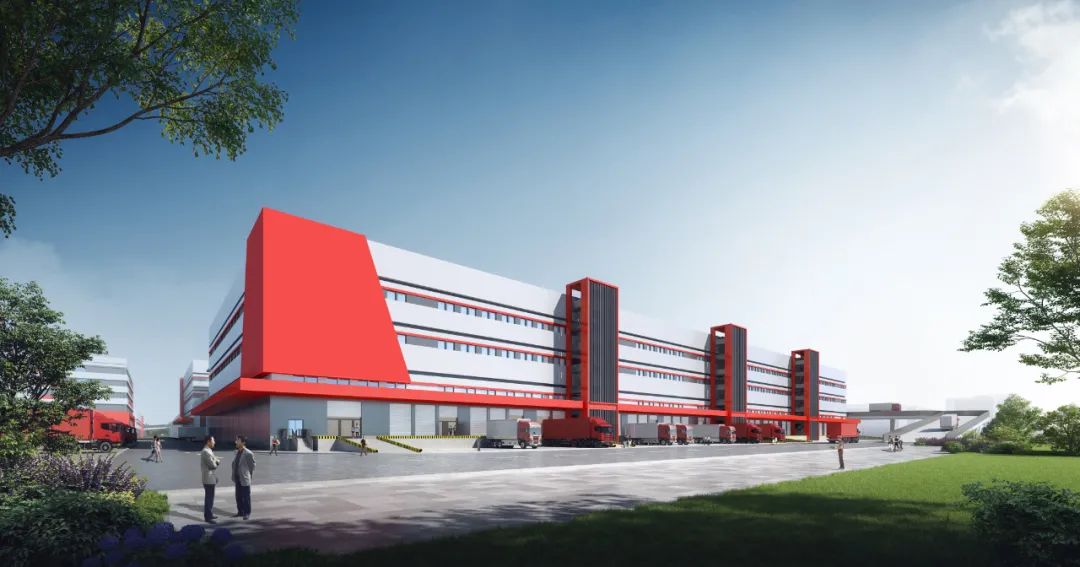 建筑整體立面風格采用現(xiàn)代簡約風格,外表簡潔大氣,同時注重細節(jié)處理,點綴紅色元素呼應京東品牌主題,增強品牌效應。